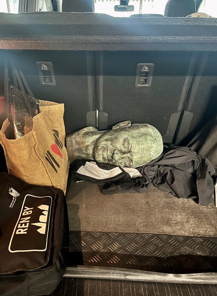 Busten af tidligere statsminister H.C. Hansen er tilbage. En vaks aarhusianer fandt busten i en ladcykel i midtbyen. Busten forsvandt fra sin sokkel i Botanisk Have tilbage i februar.