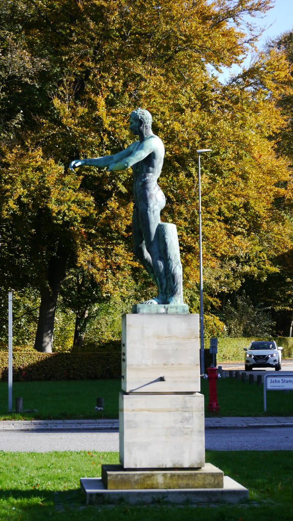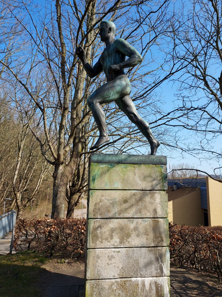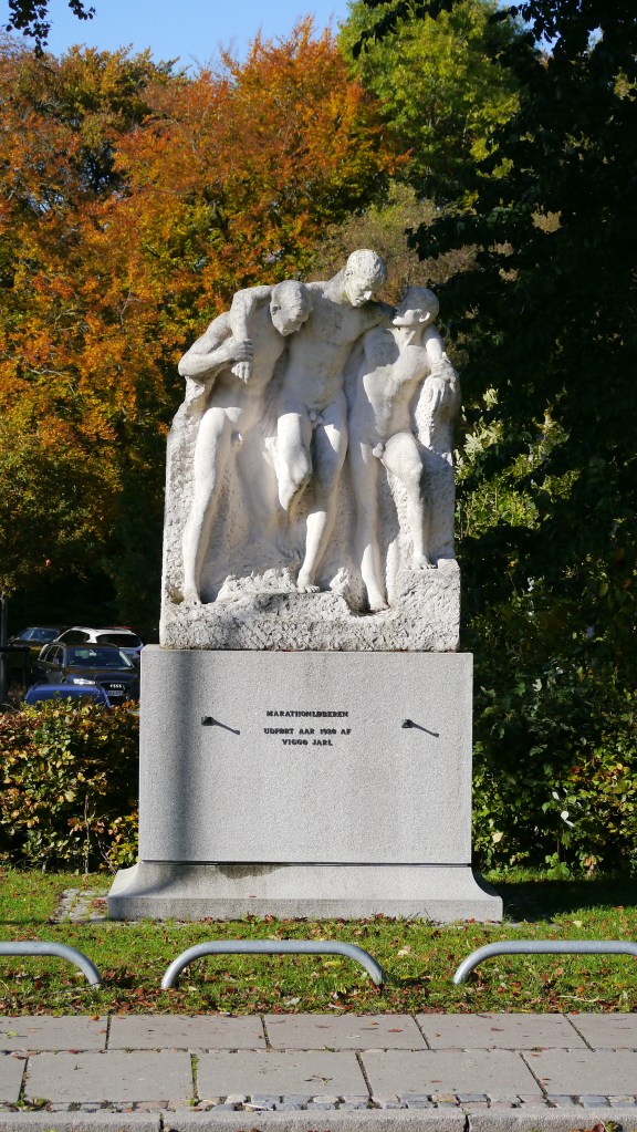 På den vestlige side af Stadion Allé står Jarls skulptur af tre unge mænd. Den viser en udmattet maratonløber, der bliver støttet af to hjælpere på det sidste stykke mod målstregen. De tre unge mænd forener ro og bevægelse i linieforløbet, samt skildrer figurernes indbyrdes psykiske kontakt.