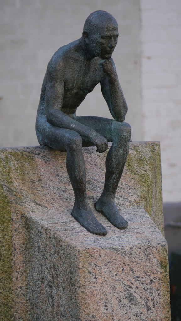 Den ‘siddende mand’ sidder oven på en tv-skærm, men vender mod den anden side af gaden til udsigten til fire granitsokler. Mandens positur antyder dyb tanke og kontemplation, måske inspireret af Rodins skulptur ‘tænkeren’ fra 1889.