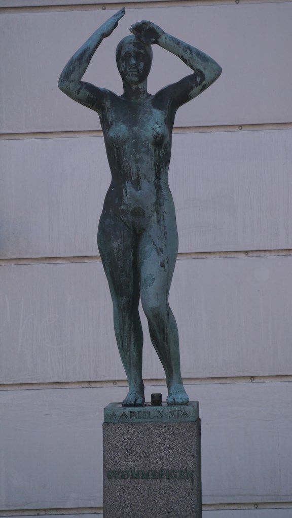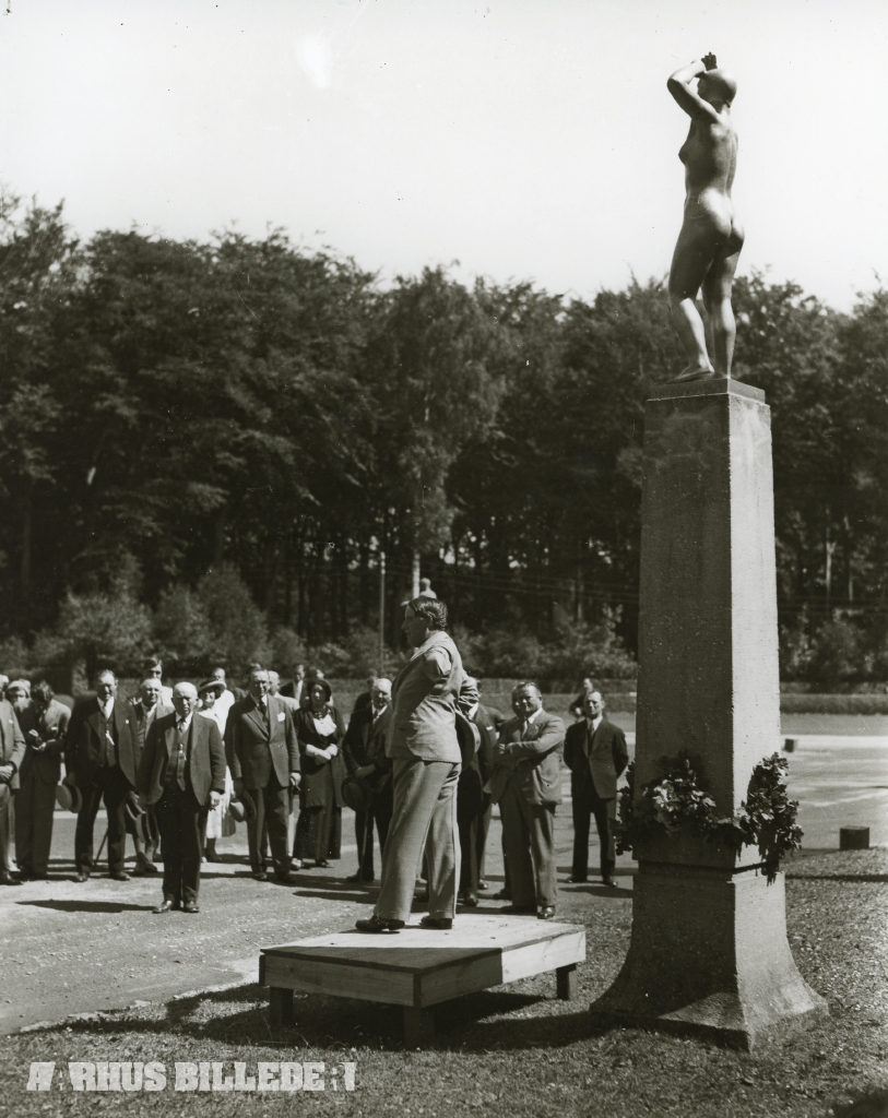 Afsløret på Stadion i 1934 men blev fjernet efter branden i 1943 og stod fra 1948 på Riisvang Stadion indtil 1971, hvor det blev flyttet til sin nuværende placering uden for Frederiksbjerg Svømmehal på Ingerslev Boulevard.