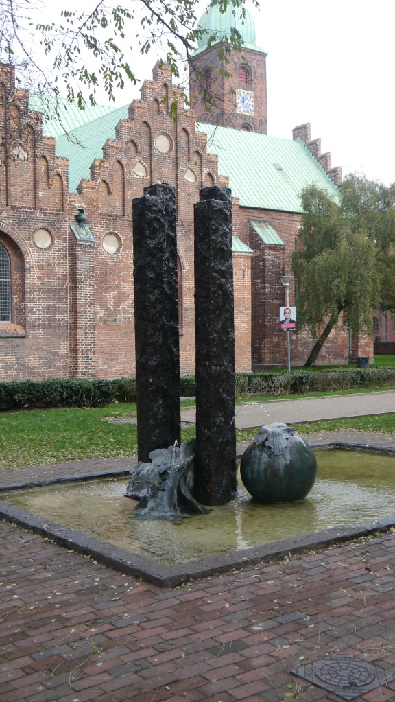 Skulptur bestilt af Byråd, Menighedsrådet og Kirkestiftet. Blandingen af vand, sten og bronze sammen med fusionen af råmaterialer med detaljerede ansigtsbilleder i bunden antyder en blanding af organisk liv og betonmaterialer, der kendetegner fødsel, død, tid og evighed.